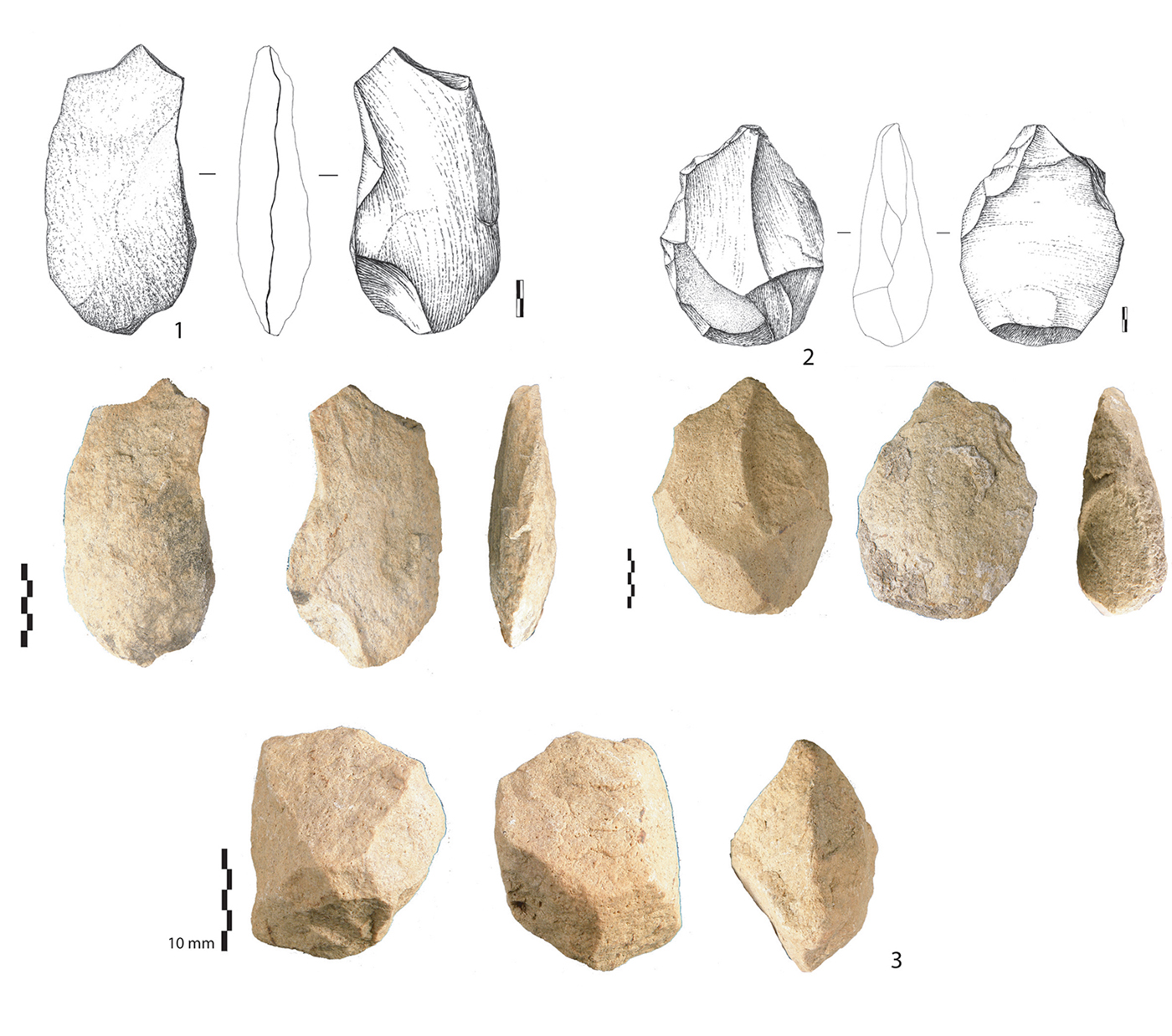 The study area is located on the east flank of a limestone plateau above the middle part of the Rhône Valley, close to the terminal part of the Ardèche Gorges. The elevation is between 160 and 175m asl (Figures 1–3). Seven large flakes (0.15–0.20m long) and one core in quartzite were found in the alluvial deposits (Figure 4). Scars are centripetal or unipolar. The thick platforms are cortical or flat. The core is bi-pyramidal with percussion impacts.