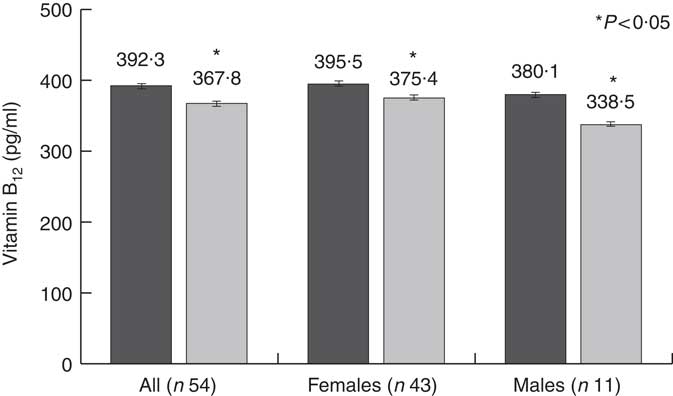 Sex is another factor that could play a role in vitamin B12 metabolism. Although epidemiological studies evaluating the prevalence of vitamin B12 in vegetarians did not report significant differences between sexes( Reference Pawlak, Lester and Babatunde 6 ), a recent analysis of a large cohort of healthy adults found that males had a risk of deficiency twice as high as females( Reference Margalit, Cohen and Goldberg 24 ). The causal mechanism of this phenomenon is yet to be determined, but previous studies have shown that genetic variations related to sex and oestrogen status could be involved in the absorption of vitamin B12 and the resulting circulating levels( Reference Tanaka, Scheet and Giusti 25 ). In our study, the reduction in circulating vitamin B12 was significant in both females and males, but was greater in males. It is important to note that changes in diet cannot explain this result, as the reduction in vitamin B12 intake was similar in the two groups. The possible relationship between sex and vitamin B12 warrants further investigation since a better understanding of this aspect could contribute to the early identification of individuals at risk.