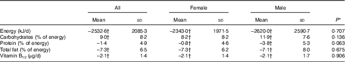 The dietary intervention with a low-energy VD resulted in significant changes in dietary profiles compared with baseline (Table 2). All subjects experienced a reduction in total energy content, carbohydrates and total fat intake. The reduction in protein intake was significant only in males. Regarding daily vitamin B12 intake, a significant decrease of 2·1 (sd 1·4) µg/d was observed, with an average decrease of 51·2 % compared with baseline in both females and males.