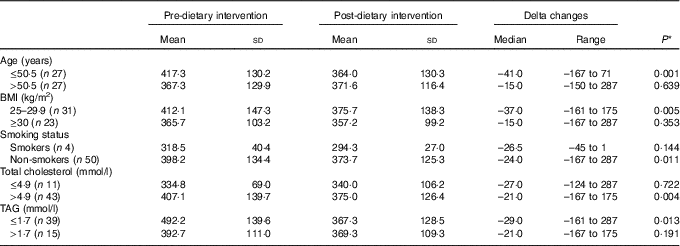 Subgroup analyses were performed to analyse the differences in the changes of circulating vitamin B12 levels, according to the median age of the study population (≤50·5, >50·5 years), to the obesity status (BMI <30, ≥30 kg/m2), to the smoking status (smokers; non-smokers) and to the cut-off values for determining high levels of total cholesterol levels (≤4·9, >4·9 mmol/l) and TAG (≤1·7, >1·7 mmol/l). A logistic regression analysis was performed to test for the probability of experiencing a reduction in circulating vitamin B12 after 3 months of VD. A reduction in circulating vitamin B12 was used as independent variable, while age, sex, BMI, smoking status, cholesterol levels, TAG and a reduction in vitamin B12 intake >28·5 % (i.e. the value of the delta changes corresponding to the first quartile of distribution in the study population) were used as covariates. Results were reported as OR and 95 % CI. A P value <0·05 was considered statistically significant.