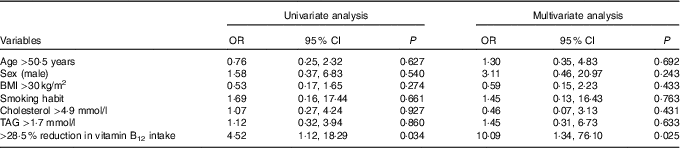 Finally, a logistic regression analysis was performed with the aim of assessing the probability of experiencing a decrease in circulating vitamin B12 levels after a VD intervention period (Table 4). In univariate analysis, only a reduction in vitamin B12 intake greater than the first quartile of the distribution of the delta changes obtained in the study population (28·5 %) conferred a significantly higher risk of experiencing a decrease in circulating vitamin B12. At multivariate analysis, after controlling for confounding variables, this association remained significant (OR 10·1; 95 % CI 1·3, 76·1).
