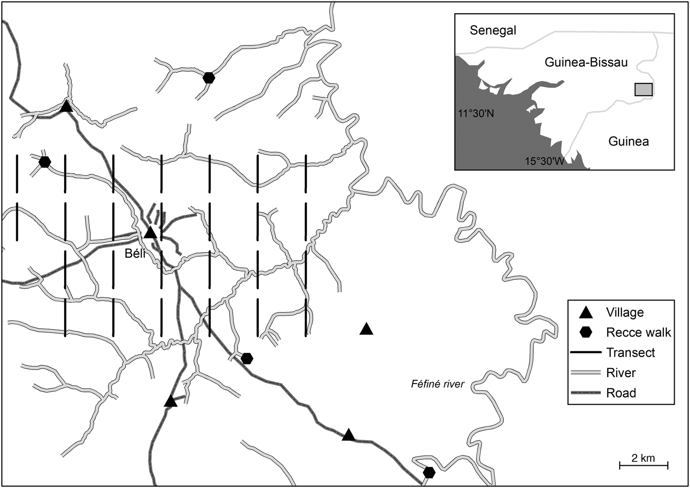 Fig. 1 Location of transect surveys and recce walks in the study area around the village of Béli, in the Boé region of Guinea-Bissau.
