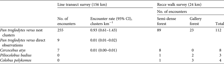 Table 2 Results from line transect surveys in the 104 km2 study area and recce walks in four additional sites to assess populations of four primate species (chimpanzee Pan troglodytes verus, sooty mangabey Cercocebus atys, Temminck's red colobus Piliocolobus badius, king colobus Colobus polykomos) in the Boé region of Guinea-Bissau (Fig. 1). For line transects, total numbers of detections (both visual and acoustic) and encounter rates of clusters are given, based on the cumulative survey effort from four visits to each transect. For recce walks, observations are separated according to the habitat type where they were made.