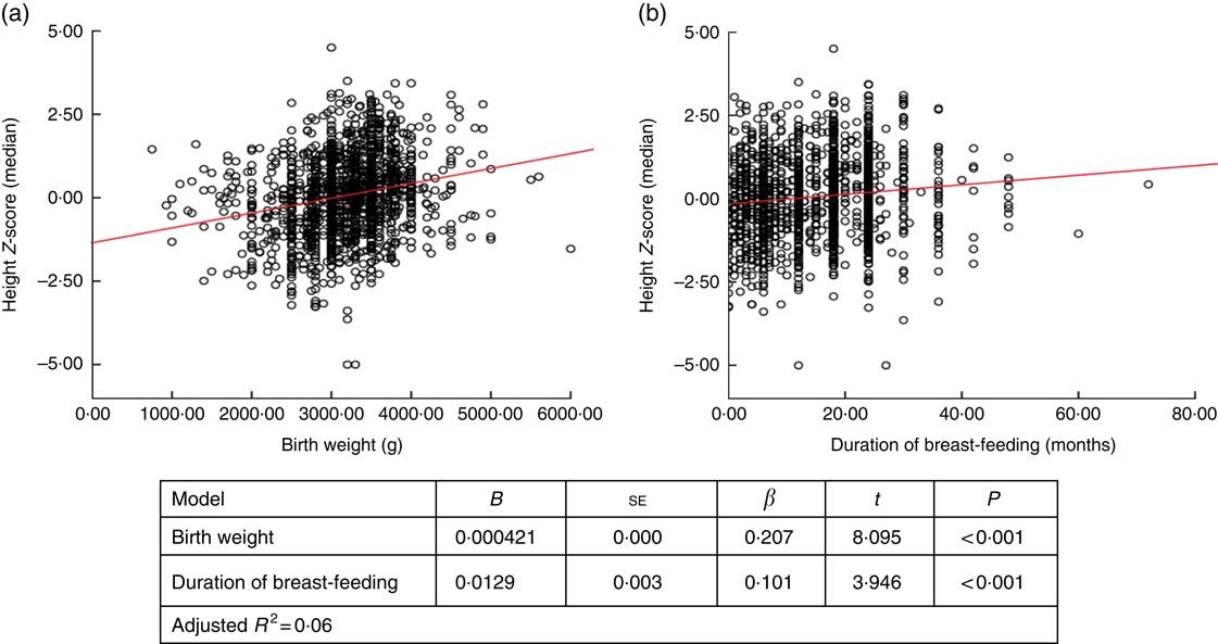 Epidemiological studies suggest that individuals who were breast-fed are taller in childhood and adulthood( Reference Martin, Holly and Smith 45 ). In previous studies, results regarding the effects of breast-feeding duration on adult height have differed: some findings have shown a positive effect but others have suggested no effect at all( Reference Djalalinia, Qorbani and Heshmat 43 , Reference Martin, Holly and Smith 45 – Reference Martin, Smith and Mangtani 47 ). In our study, children’s breast-feeding duration and height Z-score were significantly and positively associated. Breast-feeding for longer than 12 months protected the children from stunting.