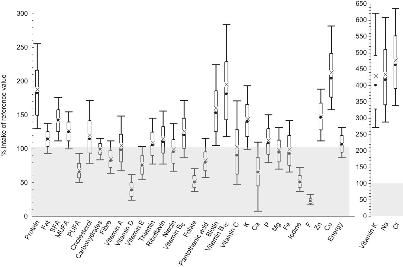 Fig. 1 Dietary nutrient and energy intakes in comparison with the D-A-CH reference values for nutrient intake among 1590 European adolescents aged 12·5–17·5 years from the Healthy Lifestyle in Europe by Nutrition in Adolescents (HELENA) Study. Data are presented as box-and-whisker plots in which the bottom and top of the box represent the 25th and 75th percentile (quartile 1 and quartile 3), respectively; the bottom and top of the whisker represent the 10th and 90th percentile, respectively; × represents the mean; and ● represents the median;