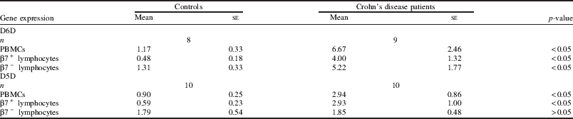 Crohn's disease (CD) is a long-term condition that causes inflammation of the lining of the digestive system. Inflammation can affect any part of the digestive system, from the mouth to the back passage, but most commonly occurs in the last section of the small intestine (ileum) or the large intestine (colon)( Reference Fiorino, Bonifacio, Malesci, Balzarini and Danese 1 ). Two rate-limiting enzymes, delta-6 desaturase (D6D) and delta-5 desaturase (D5D), are involved in the production of the polyunsaturated fatty acids (PUFAs)( Reference Xiang, Rahman, Ai, Li and Harbige 2 ). Fatty acid metabolism is involved in the immune response and inflammation processes( Reference Harbige 3 ) in patients with CD. Fatty acid changes may be relevant to the clinical course of CD( Reference Westcott, Mattacks, Windsor, Knight and Pond 4 ). Peripheral blood mononuclear cells (PBMCs) may be a useful, easily available and sensitive marker of the response of D5D and D6D genes to CD. The β7 integrin family of adhesion molecules on circulating lymphocytes may play a significant part in trafficking and localisation to the gut in CD( Reference Meenan, Spaans, Grool, Pals, Tytgat and van Deventer 5 ). The present study compared the expression of the D6D and D5D genes in PBMCs, β7+ and β7− lymphocytes between CD patients and healthy controls. Ten patients with recently diagnosed CD and ten healthy controls were studied. The expression of D6D and D5D genes in PBMCs was higher in CD patients than in healthy controls (Table). The patients with CD also had higher expression of D6D and D5D genes in β7+ lymphocytes than healthy controls (Table). Furthermore, the expression of D6D gene in β7− lymphocytes was higher in CD patients than healthy controls (Table). However, no significant differences were found in D5D gene expression of β7− lymphocytes between CD patients and healthy controls (Table). These results may indicate that the higher D6D and D5D genes expression in PBMCs, β7+ and (or) β7− lymphocytes in patients with CD is required to promote active desaturation of LA to maintain arachidonic acid (AA, C20:4ω-6) levels which we have previously reported are severely depleted in lymphocytes in CD and are essential for the functions of these cells( Reference Harbige 3 , Reference Westcott, Mattacks, Windsor, Knight and Pond4 ).
