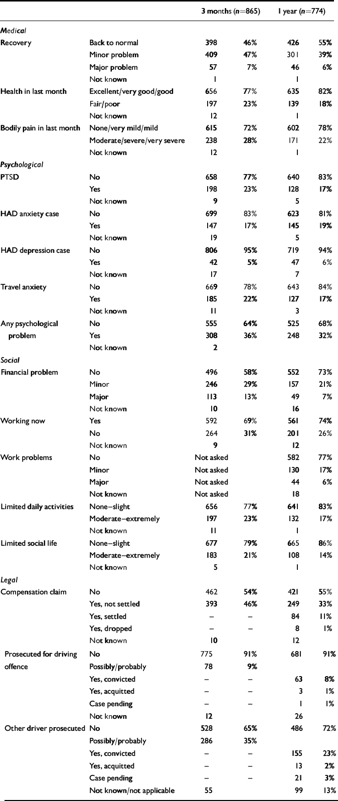 The initial questionnaire covered demographic items, memories of the accident, previous travel, previous emotional problems, current feelings and attitudes; it was based on our previous research (Reference Mayou, Bryant and DuthieMayou et al, 1993) and a six-item version of the SF36 scale (Reference Ware, Nelson, Sherbourne, Steward and WareWare et al, 1992). The 3-month and 1-year questionnaires covered present health, consultation and treatment, effects of the accident on finances, work, travel and travel avoidance and also intentions to seek compensation. All subjects were asked to complete the Hospital Anxiety and Depression (HAD) scale (Reference Zigmond and SnaithZigmond & Snaith, 1983) and a self-report of PTSD symptoms (Reference Foa, Riggs and DancuFoaet al, 1993) that provides both a severity score and a DSM-IV (American Psychiatric Association, 1994) diagnosis. We used the standard cut-off on the HAD scale and replies to self-report questions to define categories of anxiety and depression and specific phobia about travel that were similar to standard psychiatric criteria. Information was abstracted from the medical notes, and the Injury Severity Score (ISS) of the Abbreviated Injury Scale (American Association for Automotive Medicine, 1990) was calculated. This standard measure of injury severity, used in trauma research, is based on the summed squares of the three highest scoring injuries across five body regions. A score of 1-3 indicates minor injury, usually soft-tissue injury such as bruises and lacerations but also minor fracture such as a broken finger or nose.