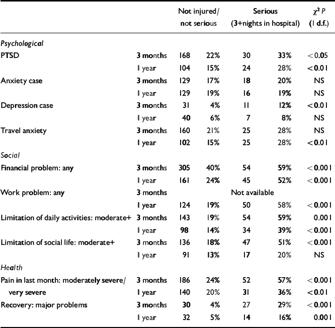 Over half of the attenders (55%) reported clinically significant medical, psychiatric, social or legal consequences 1 year later. The very small proportion of those who were seriously injured were twice as likely to suffer PTSD, travel anxiety, financial and work problems at 1 year, but the important finding of this study is that many of those in the much larger majority with less serious or no injuries also suffer long-term consequences that are largely unrelated to the type of injury.