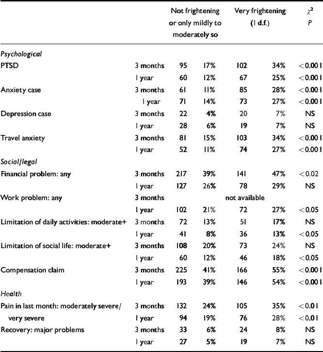 Those who reported immediately after the accident that they had been ‘very frightened’ had significantly worse outcomes at both 3 months and 1 year (Table 4).