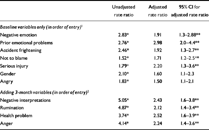 Logistic regression also was used to determine whether those at risk of chronic psychological problems at 1 year could be identified by clinical features that might be assessed easily in the A&E Department or at early follow-up review (Table 5). In the first stage, all the baseline variables included were significant predictors of 1-year outcome when entered on their own. After adjustment for the effects of the other variables and using a strict criterion of significance to take account of the number of variables (Bonferroni correction), negative emotion, prior emotional problems, perceived threat, feeling not to blame and severity of injury remained significant. The proportion of deviance explained was modest. In the second stage a number of 3-month variables, thought likely on theoretical grounds to be associated with later outcome, were added to see if this increased the accuracy of prediction. Continuing medical problems and three of the cognitive maintaining factors at 3 months were significant predictors of 1-year psychological outcome, accounting for an additional 12% of the deviance. In a final stage, ‘any psychological complications at 3 months’ was added to the model as a further predictor variable. This increased the deviance explained to 30% and the proportion of cases correctly classified to 81%.