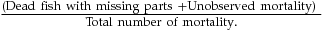 $ \frac{{( {{\rm{Dead\ fish\ with\ missing\ parts\ }} + {\rm{Unobserved\ mortality}}} ){\rm{\ }}}}{{{\rm{Total\ number\ of\ mortality}}.}}$