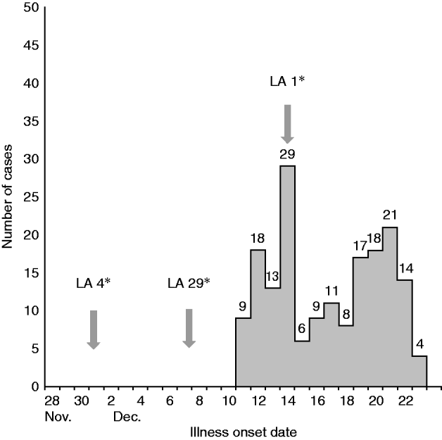 Fig. 1. Cases of gastroenteritis after eating at a restaurant by illness onset date (n=177). (For definition of a case see Methods section.) * Oyster delivery dates to restaurant from Louisiana (LA) harvest areas.