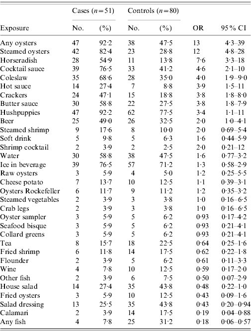 Compared with controls, cases were 13 times [95% confidence interval (CI) 4·3–39] more likely to have eaten any oysters and 12 times (95% CI 4·8–28) more likely to have specifically eaten steamed oysters (Table 1). Most (92·2%) of the cases ate any oysters and 82·4% ate steamed oysters. Cases were also more likely to have eaten cocktail sauce, horseradish, hot sauce, butter sauce, coleslaw, crackers and hushpuppies (deep-fried dumplings) compared to controls; however, through stratified analysis controlling for steamed oysters, the adjusted odds ratios for all of these foods (except horseradish) were not significant. Conversely, consumption of steamed oysters remained significant after individually controlling for coleslaw, cocktail sauce, and horseradish, with adjusted odds ratios of 9·2 (95% CI 3·6–23), 8·3 (95% CI 3·3–21), and 7·1 (95% CI 2·9–18), respectively (Table 2). Apart from steamed oysters, no other oyster dishes were significantly associated with illness.