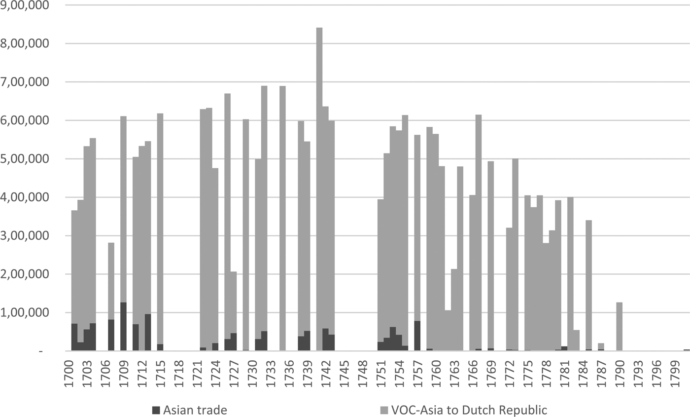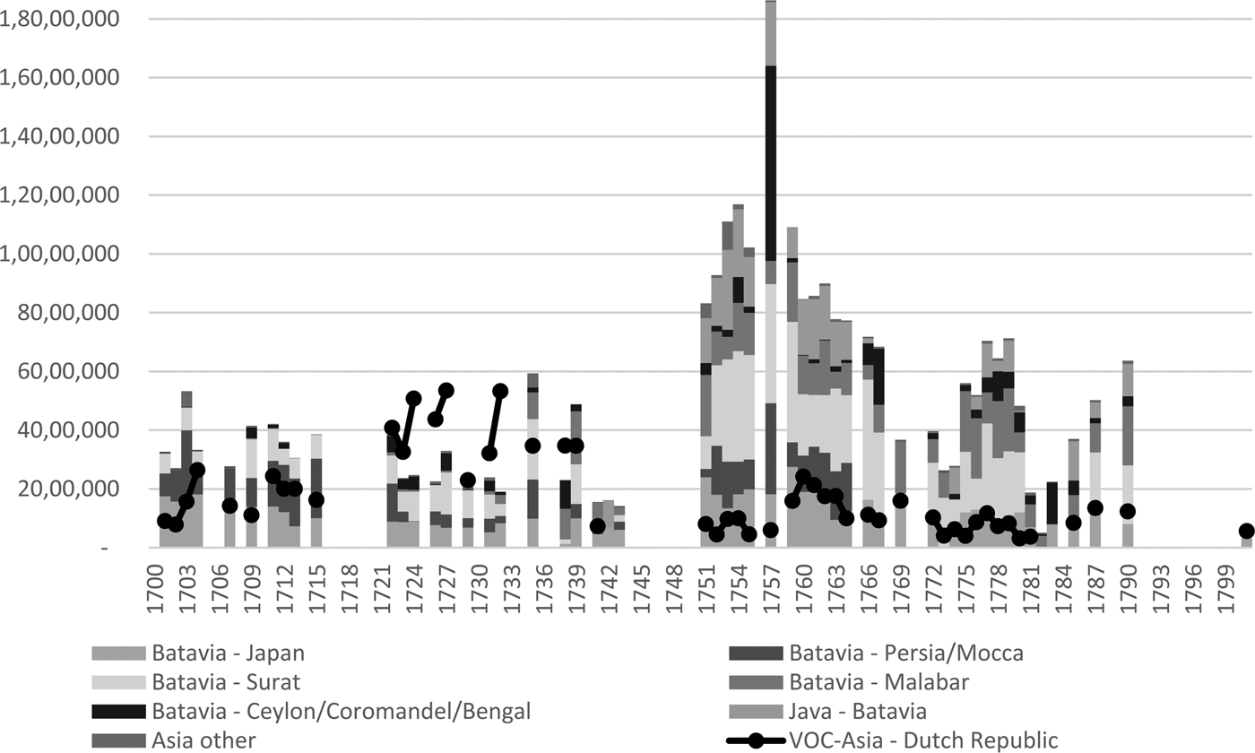Figure 2. VOC transport of sugar on intra-Asian and intercontinental routes (lbs).22Boekhouder-Generaal Batavia (BGB), available at: http://bgb.huygens.knaw.nl; last accessed 5 November 2018.
