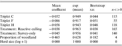 The impacts of treatment, habitat, badger-related covariates, and farm-holding characteristics on the incidence of CHBs were investigated using event history analysis. We defined a CHB event as being test-positive to bTB. Here, it was assumed that the hazard for CHBs was proportional and dependent on measured covariates. We developed models that assumed a baseline hazard common to all farms in all triplets and used relevant covariates in Cox proportional hazards models. Herd breakdowns were not recorded at the same time that an individual animal became infected, instead herds were tested at set intervals. This means that the events could not be ascribed to the point at which they occurred, rather the data were effectively interval-censored. Interval censoring leads to bias which impacts on both the direction and magnitude of the effects of covariates in the Cox model, the magnitude of which cannot be predicted a priori. We used the iterative convex minorant algorithm (ICM) as implemented in the intcox library [Reference Henschel, Heiss and Mansmann24] in R to estimate the regression coefficients of the Cox model for the full dataset. Since this procedure cannot estimate standard errors for the regression coefficients, we used a bootstrapping procedure to create upper and lower bounds on 999 samples of the original data. For this we bootstrapped by farm holding rather than individual breakdown event, following the rationale in Therneau & Grambsch [Reference Therneau and Grambsch25]. In order to assess the impact of each covariate we counted the number of samples for which the estimated coefficient was less than zero if the mean for all coefficients was greater than zero and conversely the number of samples greater than zero if the mean was less than zero. This effectively estimates the probability that a regression coefficient would encompass zero, where it could be assumed that the covariate was not having a significant effect on the hazard, in analogy with the Wald test.