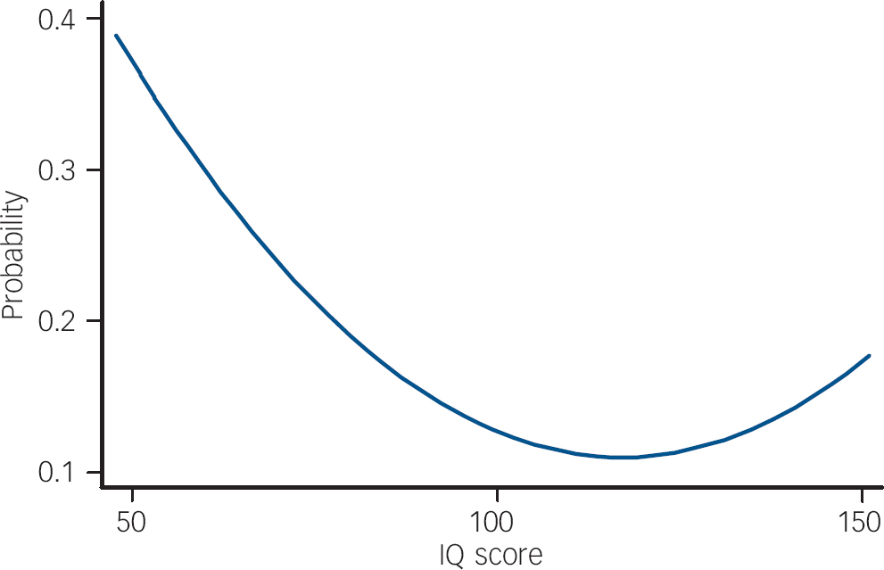 The pattern of results for narrow psychosis-like symptoms (n=364) and frequent psychosis-like symptoms (n=165) was similar, but many of the results, particularly after the second adjustment, were not statistically significant. We also used an ordered proportional odds approach that enabled us to study all three outcomes simultaneously. We found results very similar to those reported in Table 4: the IQ score linear term after the first adjustment was 0.40 (95% CI 0.22–0.72) and IQ2 and the quadratic term was 1.04 (95% CI 1.01–1.07). The equivalent results after the second adjustment were 0.45 (95% CI 0.25–0.81) and 1.04 (95% CI 1.01–1.07).