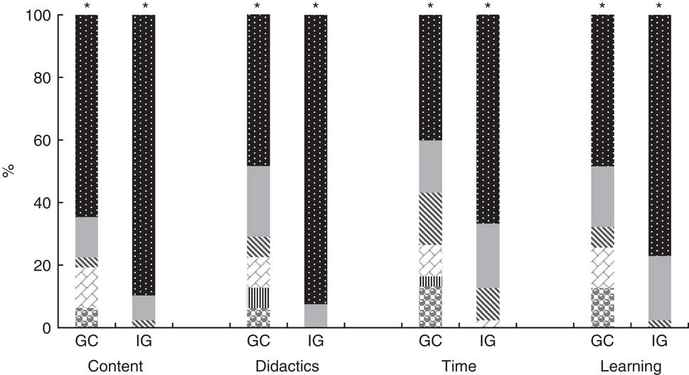 The IG reported greater learning and practical application than the CG (100·0 v. 57·9 %; P<0·001). Figure 1 shows the evaluation of the professionals regarding the content, didactics, time and learning provided by the course. This evaluation revealed statistically higher scores in the IG for all items (P<0·05).