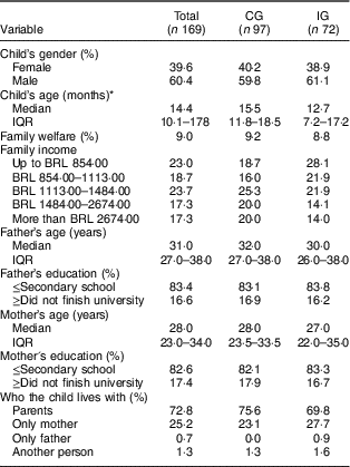 Of the infants, 60·4 % were male with a median age of 14·4 (IQR 10·1–17·8) months. The median age was higher among participants of the CG (15·5 v. 12·7 months; P=0·009; Table 2). The median age of the mothers was 28·0 (IQR 23·0–34·0) years and the median age of the fathers was 31·0 (IQR 27·0–38·0) years. Most of the parents had finished secondary school (Table 2). There were no differences between the groups prior to the nutritional intervention.