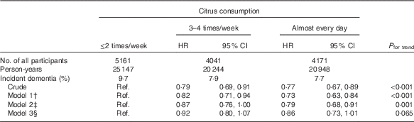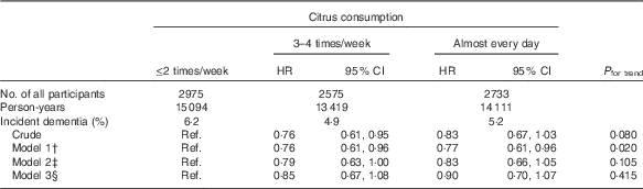Table 2 Relationships between citrus consumption and incident dementia (n 13 373)Footnote * (Adjusted hazard ratios (HR) and 95 % confidence intervals)