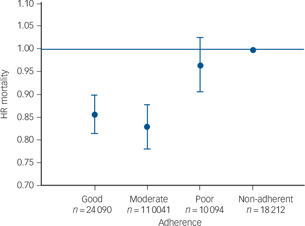 These conflicting results regarding the association of antidepressants with survival reflect the same debate regarding the effect of these medications in the general population and other clinical subpopulations. Whereas some reports indicated that antidepressant usage may decrease all-cause mortality risk, Reference Scherrer, Garfield, Lustman, Hauptman, Chrusciel and Zeringue21,Reference Gallo, Bogner, Morales, Post and Lin27,Reference Tiihonen, Lonnqvist, Wahlbeck, Klaukka, Tanskanen and Haukka28 several other studies demonstrated increased mortality among patients taking antidepressants. Reference Almeida, Alfonso, Hankey and Flicker29–Reference Sundell, Gissler, Petzold and Waern33 These limited and contradictory findings, reported in relatively small samples adjusted for diverse covariates, further stress the importance of the findings from our study, which add in the parameter of antidepressant adherence in this high-risk IHD patient population. Our findings may also shed light on the clinically important question of whether even poor (20–50%) adherence to antidepressant therapy has any benefit over non-adherence (<20%) in terms of survival. This issue has not been addressed previously, although clinicians often encounter patients who are poorly adherent to treatment (16% of this cohort). The results of our analysis (Fig. 1) indicate that this low level of adherence (20–50%) is not effective in decreasing mortality compared with the reference non-adherent group.