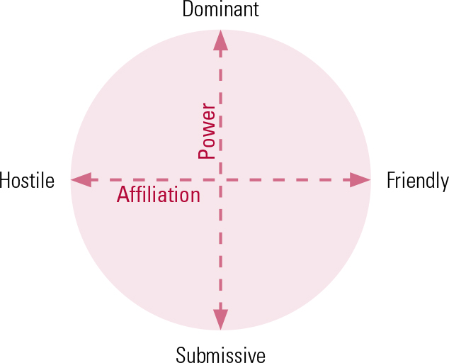 Empirical consideration of the role of clinicians’ emotions as data, however, requires a theoretical framework to provide a basis for the operational definition of such emotions. The concept of ‘interpersonal style’, based on Kiesler’s theory of interpersonal behaviour (Reference Kiesler, Schmidt, Wagner, Plutchik and ConteKiesler 1997), may be used to provide such a framework. Interpersonal style refers to how individuals characteristically relate to each other and how people perceive themselves in relation to others. Although it is considered to be a characteristic of an individual, people react to their interpersonal environment and in turn influence the relationships that others have with them. Such interactions can be considered and understood in relation to the core dimensions of ‘power’ or ‘status’ (which ranges from dominance to submission) and ‘affiliation’ (which ranges from hostility to friendliness) (Fig. 1) (Reference LearyLeary 1957; Reference Kiesler, Schmidt, Wagner, Plutchik and ConteKiesler 1997). Behaviour generally elicits a corresponding response from the affiliation dimension (i.e. friendliness elicits friendliness, hostility elicits hostility), but reciprocal responses from the control dimension (i.e. dominance elicits submission and vice versa).