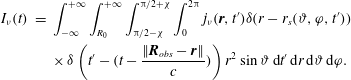 $\unicode[STIX]{x1D6FF}(t^{\prime }-(t-\Vert \boldsymbol{R}_{obs}-\boldsymbol{r}\Vert /c))$