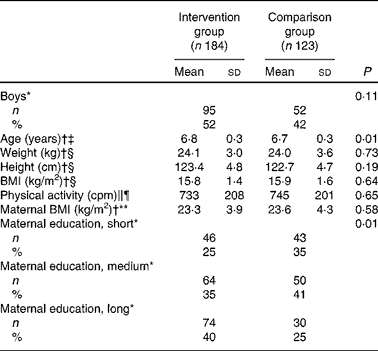 When comparing children included and not included in the analyses (due to missing information on one or more variables or lost to follow-up), there was a tendency towards that the children not included in the analyses had a higher BMI (P= 0·10). Also, the mothers of the children not included in the analyses had a shorter education (P= 0·09) and a higher BMI (P= 0·01) than the mothers of children included in the analyses. No differences were observed in sex, weight, height, age, comparison/intervention status or physical activity. The only observed dietary difference was a trend towards a higher intake of PUFA among the children included in the analyses compared with those not included (data not shown).