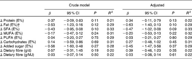 † Regression analysis included a second-order polynomial for pre-intervention intake of fat (E%).