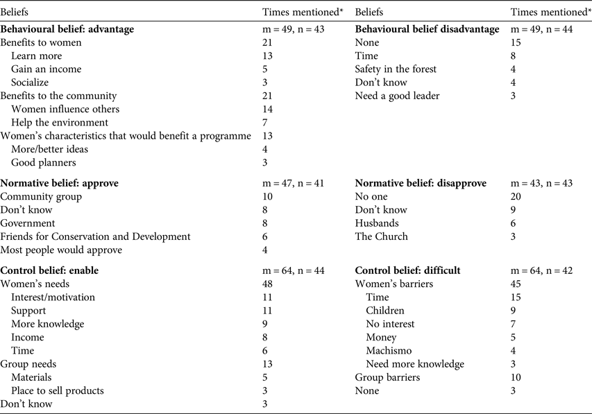 Table 2 Details of responses regarding behavioural, normative and control beliefs about women's participation in a conservation programme. Not all respondents were asked each question, as some were not local and did not have any knowledge of the local women.