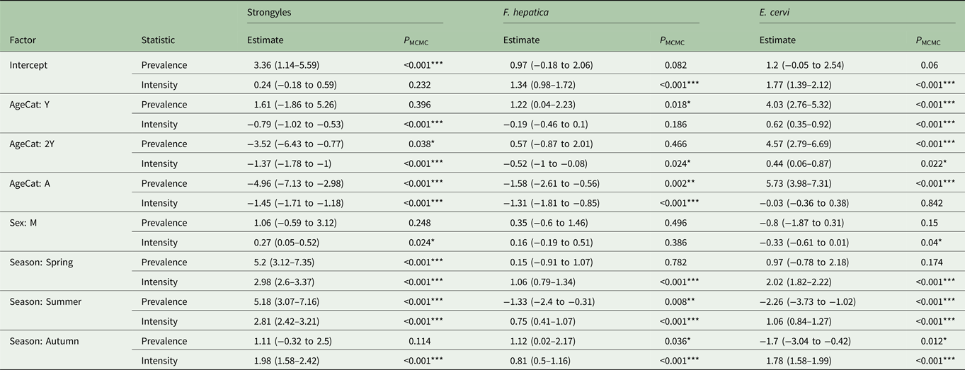 Fasciola hepatica increased in intensity after the winter (P MCMC < 0.001) as did strongyles, but decreased in prevalence in the summer (P MCMC < 0.001) and prevalence was highest in the autumn compared with the winter (P MCMC = 0.036), spring (P MCMC = 0.042) and summer (P MCMC < 0.001). Unlike strongyles, F. hepatica prevalence peaked in yearlings (P MCMC = 0.01) rather than in calves, and decreased in prevalence and intensity thereafter. The intensity of infection was lower in 2-year-olds than in calves (P MCMC = 0.024), and adults had lower prevalence and intensity of infection compared to all other age classes (P MCMC = 0.002 for prevalence; P MCMC < 0.001 for intensity). There was no evidence of a sex bias in either prevalence (P MCMC = 0.496) or intensity (P MCMC = 0.386) of F. hepatica infection, in contrast to the results of the strongyle model.