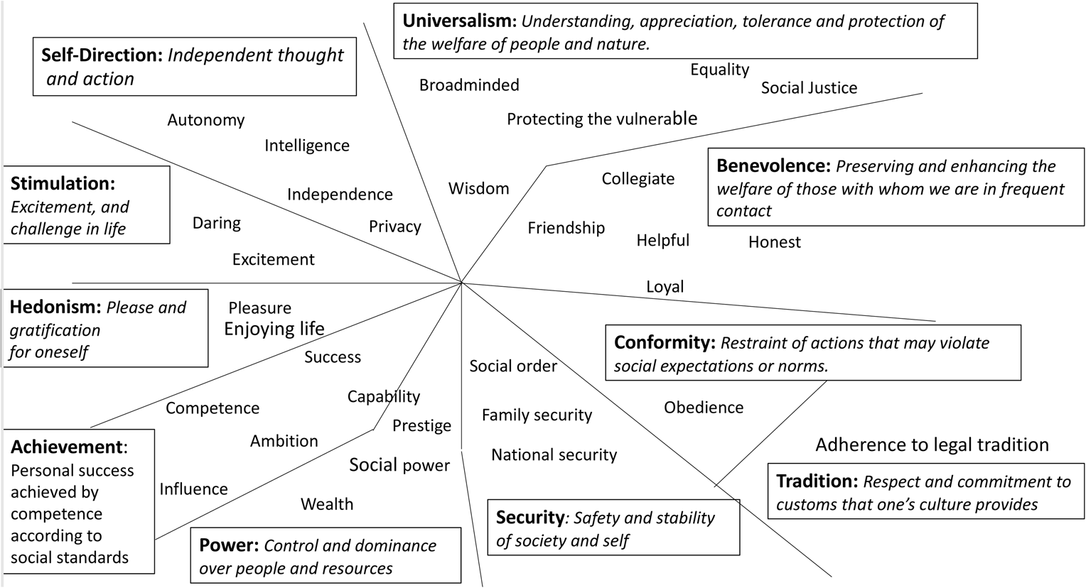Figure 2. A graphic representation of the Schwartz model of values and coding framework. The overarching motivation of the value is presented in the box. The associated segment sets out the values associated with the motivation. This graphic is a modified version of the graphic representation (Schwartz, Reference Schwartz1992; Reference Schwartz2012).