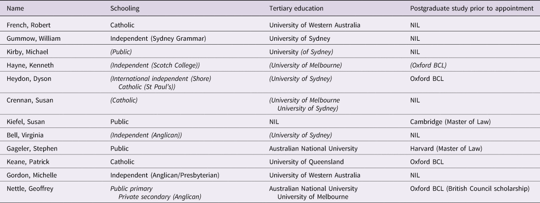 An extensive 2018 study of the career trajectories of Australian supreme- and district-court judges revealed that the majority of judges had attended independent and Catholic schools for their pre-tertiary education, followed by university education at the oldest and most prestigious universities in Australia (Bartlett and Douglas, Reference Bartlett and Douglas2018). The High Court justices in our study also followed those pathways (Table 2).