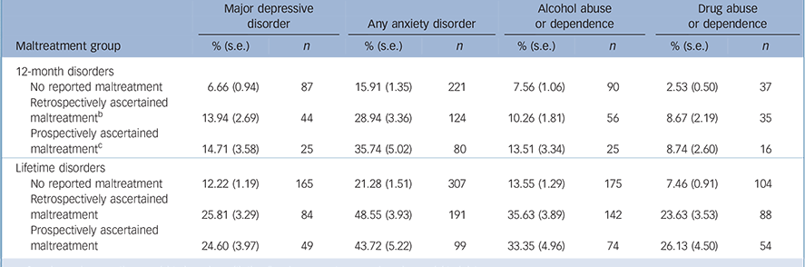 TABLE 2 Prevalence of 12-month and lifetime DSM-IV mental disorders among those with prospectively, retrospectively or no reported maltreatment a