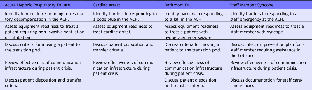 Four scenarios were developed by an emergency medicine faculty member with experience in simulation and medical education using input from nursing and physician leadership. Scenarios were designed to represent both common clinical situations, as well as low frequency, high acuity events that may arise in the ACH. The scenarios included acute hypoxic respiratory failure, cardiac arrest, fall in bathroom, and staff member syncope. Emergency medicine trained physicians, critical care and medical-surgical trained registered nurses (RNs), and an ambulatory medical assistant (functioning as an inpatient certified nursing assistant [CNA]) were used as the clinical care team in these scenarios. The learning objectives for each scenario can be found in Table 1.