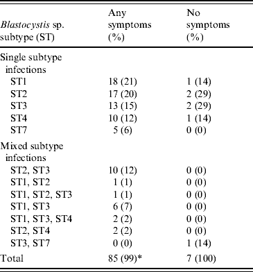 ST5–ST9, occurring infrequently in humans, could be mainly zoonotically transmitted [Reference Stensvold2]. In the present study, ST7 and ST9 isolates were seen in seven of the individuals, six (86%) of whom were symptomatic. It should be investigated to what extent such potentially zoonotic subtypes are correlated with disease, and clearly, more studies should aim at clarifying issues related to transmission routes and host specificity.