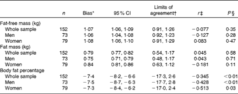 † 95 % Limits of agreement (2 sd of the mean difference) expressed as the ratio of DXA:isotope dilution values of fat-free mass and fat mass. The values of body fat percentage are given on the original scale.