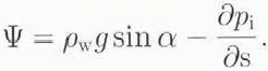 and represents the rate of change (t is time) of cross-sectional area due to meltback of the channel walls (the first term) and viscous closure of the ice (the second term). In terms of its provenance, this equation is actually a kinematic boundary condition for the external viscous ice-flow problem, since the ice/water interface is a free boundary. pi is the ice-overburden pressure, ρi is the ice density, K is proportional to the flow constant in Glen's law, and n is the flow-law exponent, often taken as n = 3. A further equation for S follows from mass conservation of water in the channel, which takes the form