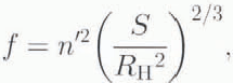 where ń is the roughness coefficient and RH is the hydraulic radius (= S/l, where l is the perimeter). For a circular channel (S/RH 2)2/3 =(4π2/3)≈ 5.4, so that if n’ = 0.1 m −1/3s, then f~0.05 m −2/3s2.