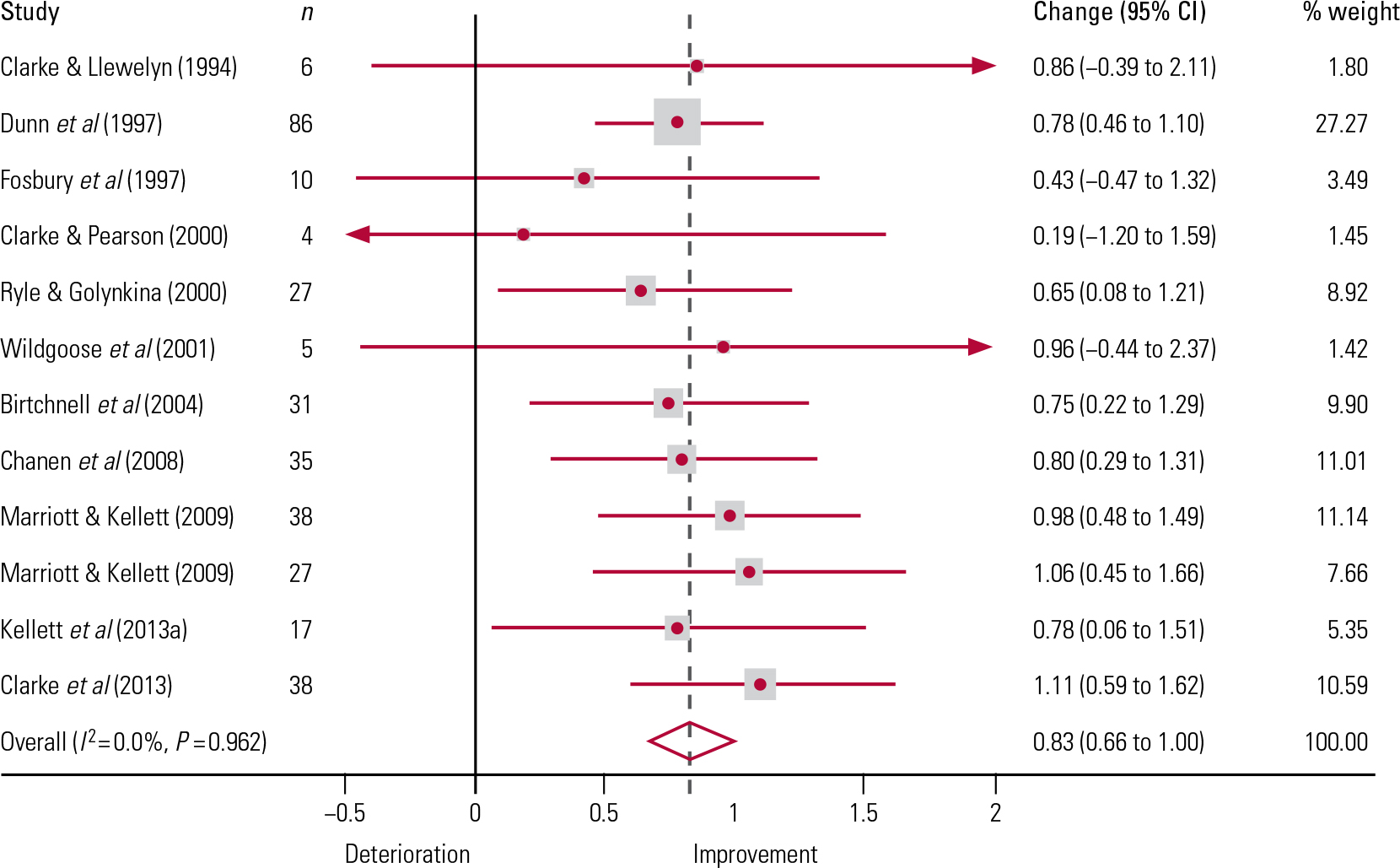 Outcome data from each study were converted to a common metric, Cohen’s d. To be included in calculations of the overall uncontrolled effect size, studies were required to have: (a) used psychometrically sound outcome measures at least pre- and post-CAT; and (b) reported means and standard deviations (s.d.) of outcomes at pre- and post-CAT and associated sample sizes. Eleven studies met these inclusion criteria, giving us twelve data-sets (one study, Marriott & Reference Marriott and KellettKellett (2009) contained two data-sets: 16- and 24-session CAT).