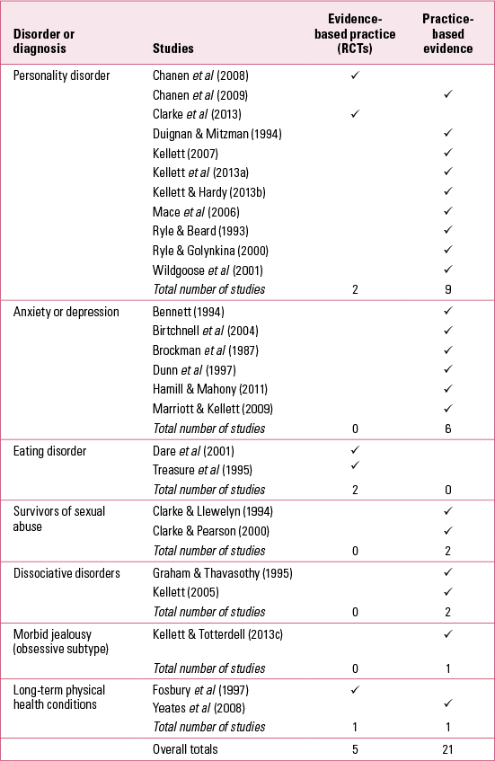 The CAT evidence base consists of 4 RCTs, in addition to 22 studies of effectiveness conducted in routine clinical practice using a variety of outcome methodologies. Table 1 shows that the majority of the published outcome studies (11 of 21, or 42%) were completed with patients with more severe difficulties (personality disorder).