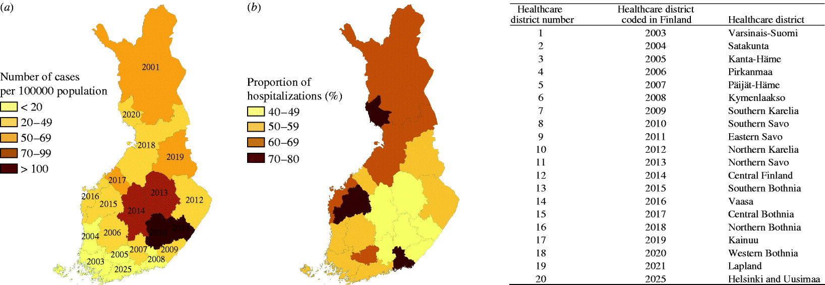 Fig. 1. (a). Average annual incidence of Puumala virus infections by healthcare district in Finland, 1995–2008. (b) Proportion of hospitalized cases of the total number of cases by healthcare district in Finland, 1996–2007.