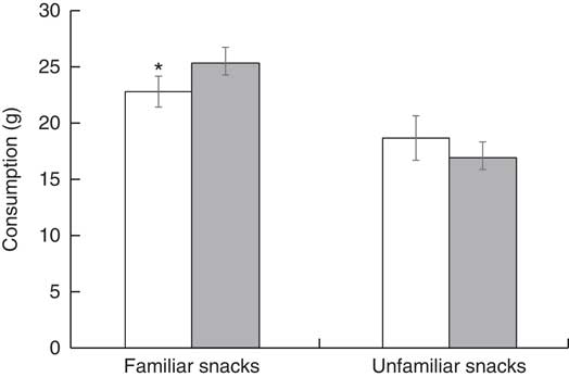 Participants who did not complete both tasting sessions were excluded from analysis. Consumption data were excluded if ≤0·000 g, as negative consumption was not possible. Liking data associated with consumption data ≤0·000 g were also excluded as participants were not able to rate taste liking without sampling any of the snack presented to them. Familiarity data were collected via an online survey that participants completed prior to attending tasting sessions.