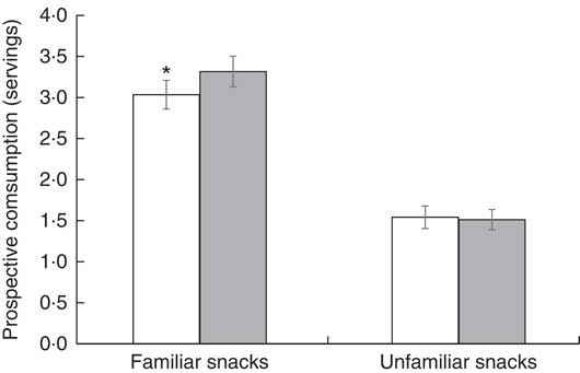 Outcome measures were liking, prospective consumption, actual consumption (how much participants sampled) and familiarity. Liking was measured on a 9-point hedonic scale ranging from 1=‘dislike extremely’ to 9=‘like extremely’. Prospective consumption was measured by participants selecting the number of servings (i.e. 0, 0·5, 1, 1·5, 2, 2·5, 3, 3·5, more than 3·5) they thought they would eat of the snack ‘right now’. Familiarity was measured in an online survey containing the same photos of the snacks as the tasting sessions, which participants completed prior to attending the tasting sessions. Familiarity was rated on a 5-point Likert scale ranging from 1=‘not familiar at all’ to 5=‘very familiar’. Liking, prospective consumption and familiarity data were collected using Compusense Cloud Software as part of the Compusense Academic Consortium. How much participants sampled was measured to 0·2 g (Ohaus, model number NV 4101) by subtracting the post-tasting weight from the pre-tasting weight; this was recorded manually on participants’ individual slips.