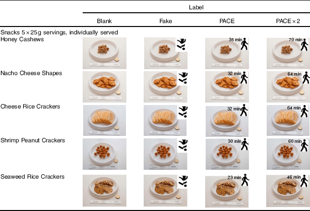 Recently, the Royal Society for Public Health in the UK called for an activity-equivalent label to be implemented as a FOP labelling format( Reference Cramer 23 ). The physical activity calorie equivalent (PACE) label is an exercise-equivalent FOP label that displays, as a pictogram, the number of minutes of walking (or other forms of exercise) required to burn off the kilojoules in one serving of a food. There are different designs of PACE labels, some may also include kilojoule information per serving alongside the exercise-equivalent information( Reference Antonelli and Viera 24 – Reference Montford, Peloza and Goldsmith 26 ). Other activity-equivalent labels have previously been referred to as a physical activity-based label( Reference Dowray, Swartz and Braxton 27 ) or a physical activity label( Reference Masic, Christiansen and Boyland 28 ). In the present study, we consider a PACE label as any label that displays a pictogram representing the amount of physical activity required to burn off the kilojoules in a serving of food. In controlled studies where participants ordered fast foods( Reference Antonelli and Viera 24 , Reference Dowray, Swartz and Braxton 27 ) and snack foods( Reference Masic, Christiansen and Boyland 28 ) online, it was found that the presence of a PACE-type label (presented as either minutes or miles to walk) significantly reduced the number of kilojoules participants ordered. Similarly, intervention studies found that presenting the PACE information at the point of sale significantly reduced selection( Reference Scourboutakos, Mah and Murphy 29 ) and purchasing( Reference Bleich, Herring and Flagg 30 ) of sugar-sweetened beverages. Only two previous studies have assessed the impact of a PACE-style label on food choice and consumption( Reference Montford, Peloza and Goldsmith 26 , Reference James, Adams-Huet and Shah 31 ). In a controlled setting, it was found that the numbers of kilojoules ordered and consumed from a fast-food lunch menu were reduced in the presence of written exercise-equivalent information( Reference James, Adams-Huet and Shah 31 ). Similarly, it was found that providing participants with PACE information (including kilojoule information) prior to watching a 30 min video significantly reduced the amount of cheese crackers participants consumed over the duration of the video screening( Reference Montford, Peloza and Goldsmith 26 ). Furthermore, there is evidence that the PACE label is preferred by consumers over kilojoule labelling, with one study finding 82 % of participants preferred the PACE label( Reference Dowray, Swartz and Braxton 27 ). Qualitative studies have also found that participants were able to interpret the PACE label easily and believed that the PACE label would assist them to apply the foods’ kilojoule information into their food choices( Reference Swartz, Dowray and Braxton 32 ). These studies suggest that the PACE label may be effective at lowering kilojoule ordering and purchasing( Reference Antonelli and Viera 24 ), consumption of fast food( Reference James, Adams-Huet and Shah 31 ) and is preferred and understood by consumers( Reference Swartz, Dowray and Braxton 32 ). Additionally, it has been suggested that consumers are less likely to look at labels of products they are familiar with or consume regularly( Reference Maubach, Hoek and Mather 22 ), but may pay attention to FOP labels presented on novel/unfamiliar brands( Reference Becker, Bello and Sundar 33 ). The previous studies have investigated readily available, regularly consumed fast foods, sugar-sweetened beverages and snack foods( Reference Scourboutakos, Mah and Murphy 29 , Reference Antonelli and Viera 24 , Reference Dowray, Swartz and Braxton 27 , Reference Masic, Christiansen and Boyland 28 , Reference Montford, Peloza and Goldsmith 26 , Reference James, Adams-Huet and Shah 31 ). Whether the same effect would be seen in both familiar and unfamiliar snack foods has not previously been investigated. The influence of the PACE label on actual consumption and prospective consumption of both familiar and unfamiliar discretionary snack foods remains unclear.