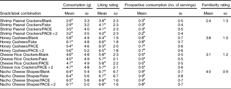 Table 4 Mean consumption, liking, prospective consumption and familiarity results for each of the four test snack snacks (Shrimp Peanut Crackers, Honey Cashews, Cheese Rice Crackers and Nacho Cheese Shapes) and labels (Blank, Fake, PACE and PACE×2) among 153 university students (126 females, twenty-seven males, mean age 24·3 (sd 4·9) years) enrolled in an undergraduate nutrition degree at Deakin University, Australia