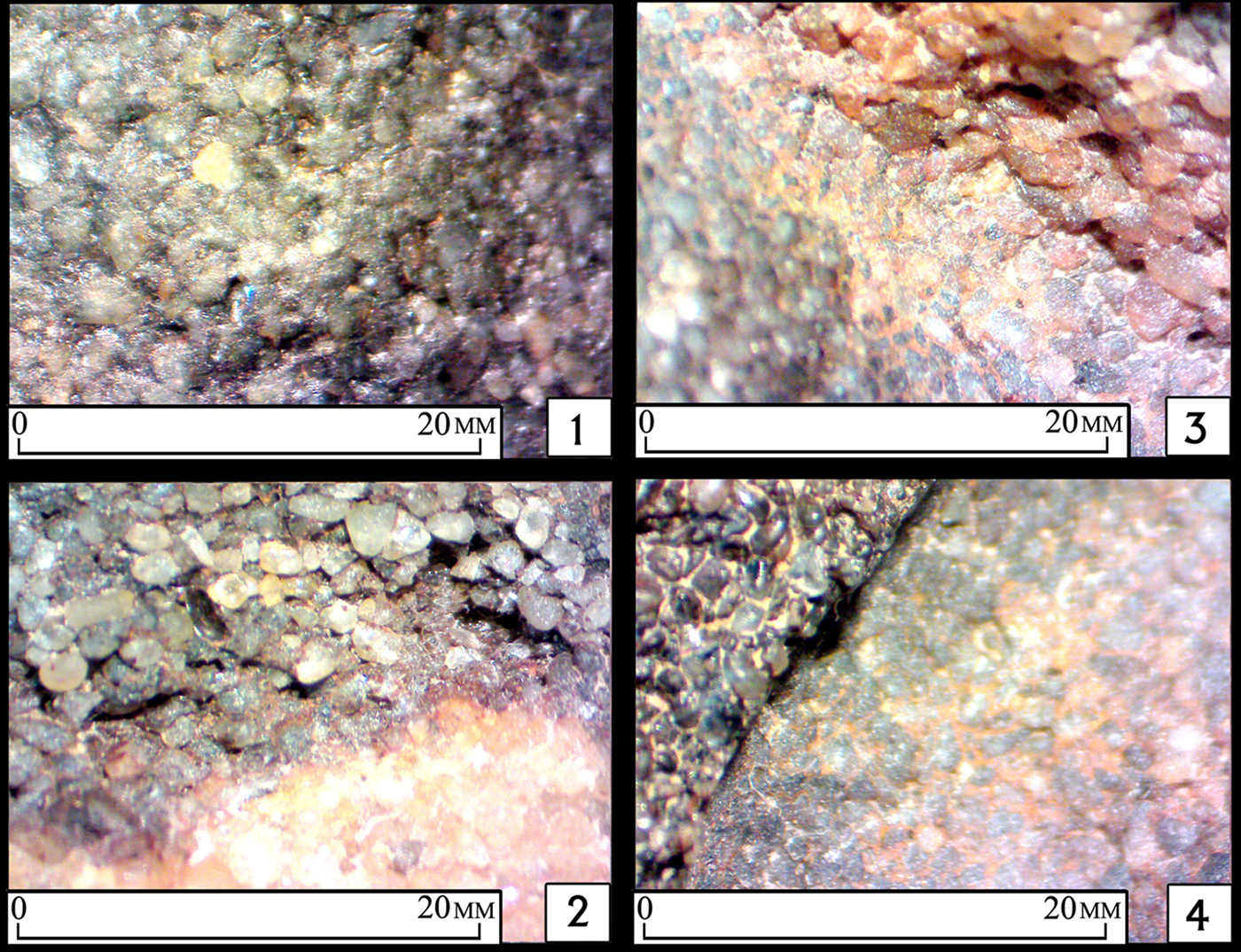 Figure 5. Microscopic examination of the ‘younger’ figurine: 1) traces of water erosion; 2) traces of scraping near the ‘neck’; 3) traces of strikes on the nose; 4) traces of scraping on the left eye (figure by S. Radchenko).