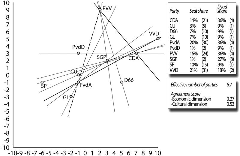 To assess whether party competition in 2002 was centrifugal or centripetal we examine whether a core is present in the political space. Figure 3 presents all 11 median lines that divide the political space in two halves with majority coalitions.10 For instance, the vertical line between CDA and LPF divides the space between east and west. The CDA and the LPF can form a majority coalition with parties on each side of this median line: in the east with potential coalition partners D66 and VVD, and in the west with the potential coalition partners CU, GL, PvdA, SGP and SP. Figure 3 shows that there is no core in the Dutch party system in 2002. Since one median line [z PvdA , z LPF ] does not go through z CDA , the CDA cannot be classified as a core party. However, Ray’s (Reference Ray1989) modification of the concept of the core excludes non-credible coalitions. In 2002 the PvdA and the LPF could not form a credible coalition alternative, as the former repeatedly declared in the run-up to the elections that it refused to cooperate with the LPF.11 Thus, as all credible majority coalitions require the participation of the CDA, it can be qualified as the modified core party in 2002 and it still dominates the coalition formation process. The presence of a core party suggests that the direction of competition in the political space was centripetal and a centrist coalition was most likely to form. The outcome of the coalition-formation process confirms these expectations. The CDA sought to rein in the LPF electorally by making it a coalition partner. Cooperation between these parties on the one hand, and the VVD on the other, made most sense in terms of coalition range and size (De Lange Reference De Lange2011). The preferences of these three parties led to the formation of the coalition {CDA, LPF, VVD} in the aftermath of the 2002 elections.