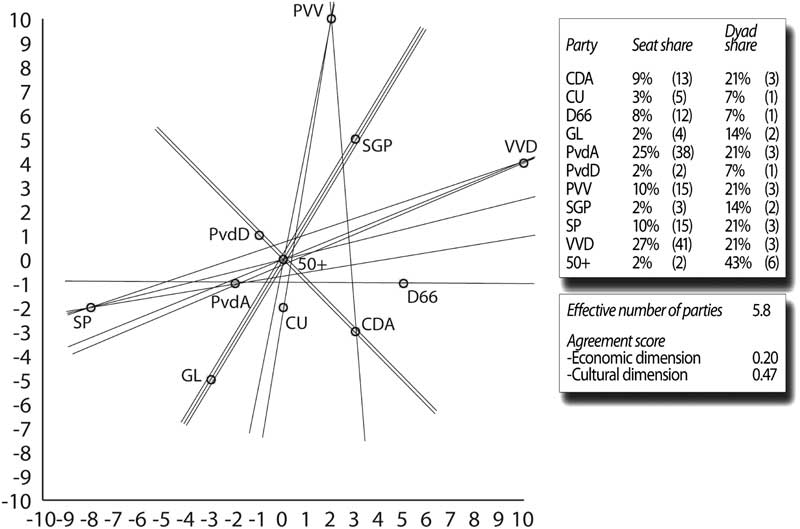 Figure 6 maps the competitive political space in 2012 and depicts the median lines that determine the majority coalition alternatives. Remarkably, while all median lines run through the middle of the figure, no core or pivotal player can be identified. Although six median lines run through the newly established elderly party 50+, the party is superfluous in all but one of the coalition governments they delineate. None of the other parties that are included in the median lines can be qualified as a pivotal player either. Given their size, no majority coalition is possible without the PvdA and/or VVD, but due to the fragmentation and polarization of the Dutch party system neither is able to singly dominate the coalition-formation process in 2012.