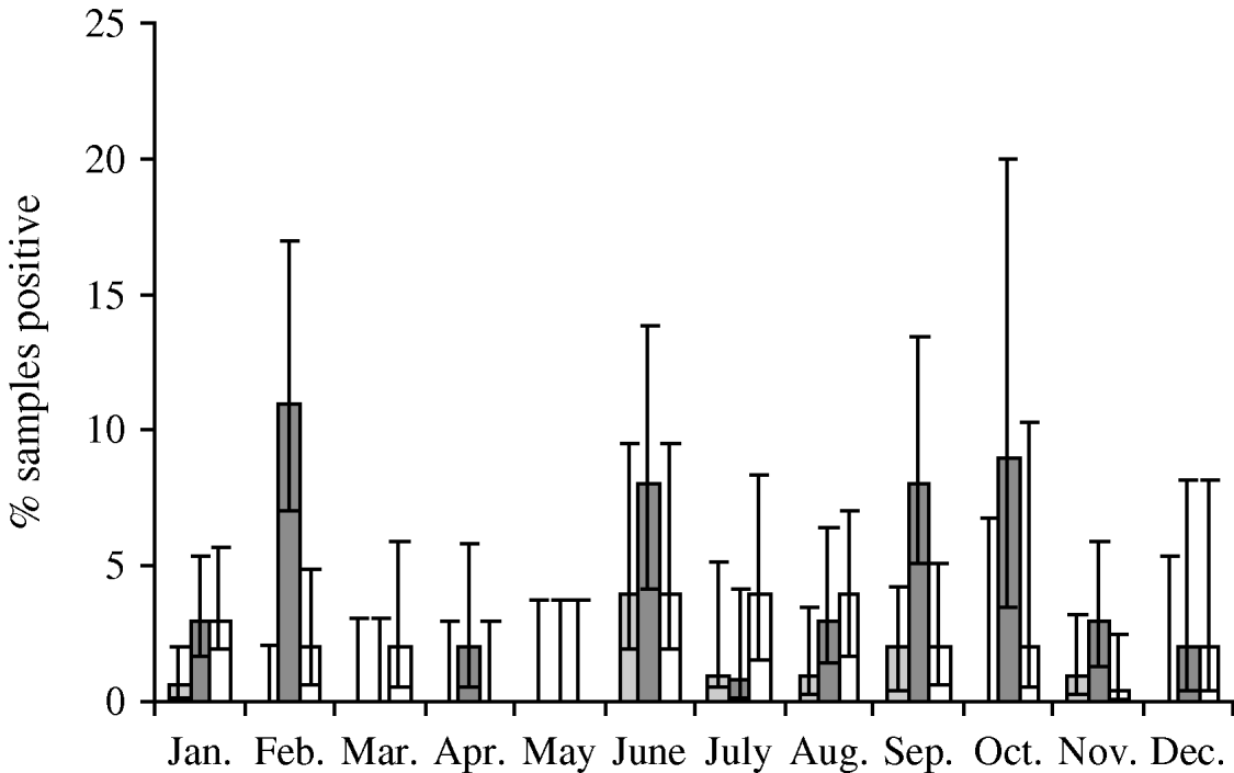 Faecal samples were collected from 2084 wild birds of 99 different species from 167 locations between July 2004 and October 2006. The overall prevalence of presumptive E. coli isolated from faecal samples was 50·8% (95% CI 48·6–52·9%), isolated from 94 bird species. Of those samples from which E. coli was isolated, the prevalence of stx1, stx2 and eae genes was 1·5% (95% CI 0·9–2·5), 7·9% (95% CI 6·4–9·8) and 4·9% (95% CI 3·7–6·4), respectively. The stx1 genes were isolated from 12 wild bird species, stx2 genes from 30 species and eae genes from 27 species of wild bird. There were significant differences in the monthly prevalence of E. coli (P<0·001), both virulence genes stx1 (P=0·02) and stx2 (P<0·001) but not eae (P=0·17). In the majority of samples, eae, stx1 or stx2 genes were detected individually; however, in 0·4% (95% CI 0·2–1·0) of samples both stx1 and eae genes were detected, and in 0·2% (95% CI 0·05–0·7) of samples both stx2 and eae genes were detected. It should be noted that multiple virulence genes were not necessarily derived from the same E. coli isolate as a pool of 10 E. coli isolates that were cultured from each faecal sample were screened by PCR. E. coli was most prevalent during January, June and October (Fig. 1). The stx1 gene was detected most frequently in E. coli isolated in June whereas stx2 showed peaks of occurrence in February, June, September and October (Fig. 2).