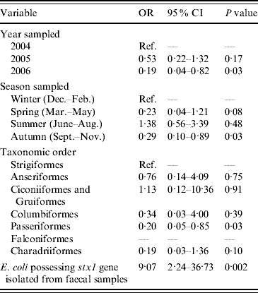 Table 1. Factors associated with the isolation of E. coli possessing the virulence gene stx1 from wild bird faecal samples as determined by multivariable logistic regression analysis (n=1196)